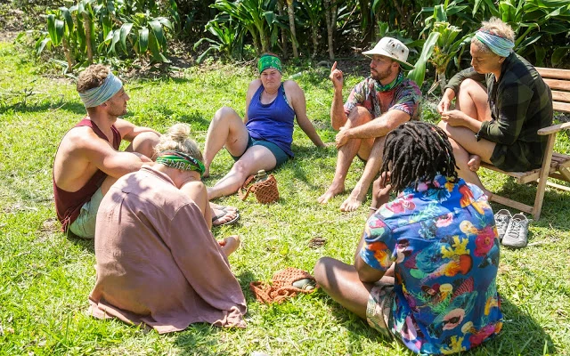 Challenge:The Cruel Sea One person from each tribe will swim out, then race up a platform, dive into the water and retrieve a ring and bring it back. The next person from the tribe will then do the same. Once a tribe has collected all five rings, the two remaining tribe members will attempt to land those rings on posts. The first tribe to finish wins. Additional Stipulation: For winning the Challenge Advantage, Zamba only needed to retrieve four rings instead of five. Winner:Vuna(sent Amy Eliason to Immunity Island)
