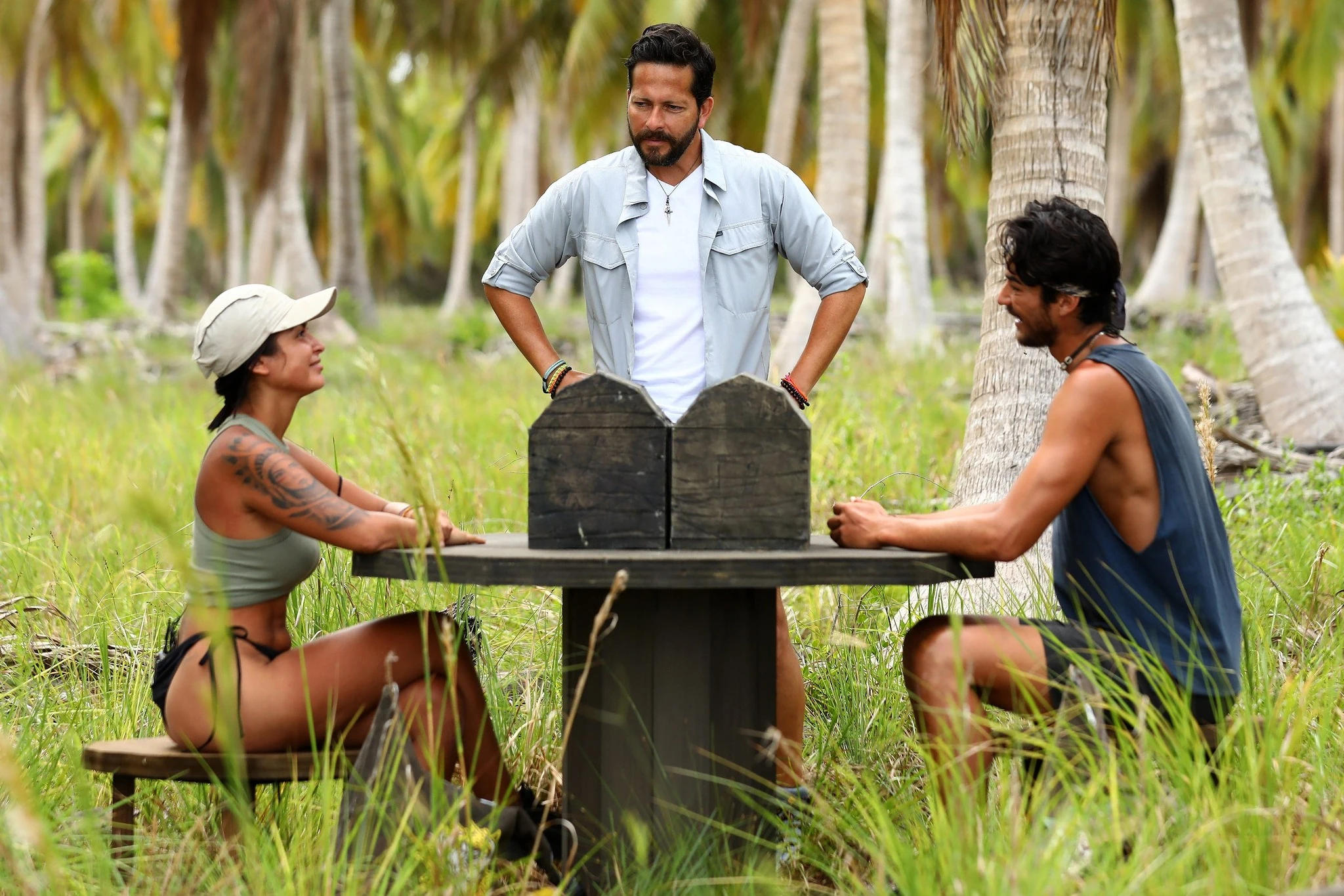 Challenge: The tribes will send one member each to perform this challenge. Each castaway will have a closed chest, one chest will contain a pair of symbols while the other will be empty. A coin will be flipped to determine which castaway will be able to open their chest and see what is inside. The castaway who did not open their chest will question their opponent about what their chest contains, while this one will try to confuse or convince them. Once ready, the castaway who did not open their chest will decide whether to keep their chest or choose their opponent's chest. Whoever keeps the chest containing the symbols wins reward.